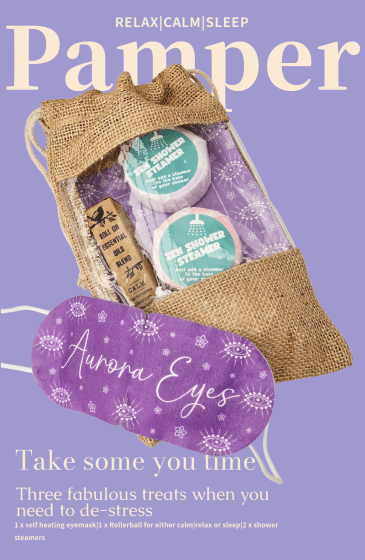 – Pick one of our rollerballs, and team with our Sensory Retreats eyemask.’ Aurora (Barely there Camomile) Self-Heating Eye Masks, and couple of our shower steamers all presented in a jute bag for the perfect gift. Relax, calm or sleep. A choice of 3 different Rollerballs